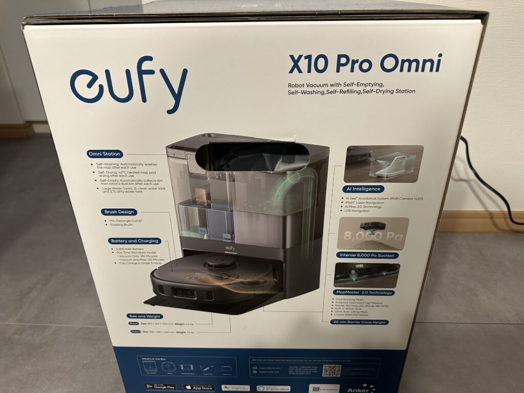 Anker Eufy X10 Pro Omniは写真の箱に梱包されて届きます。